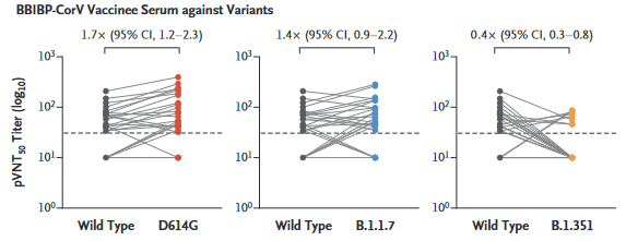 国药疫苗接种者血清里中和抗体对D614G突变株、英国突变株(B.1.1.7)以及南非突变株(B.1.351)的中和效率变化情况 | 图源[7]