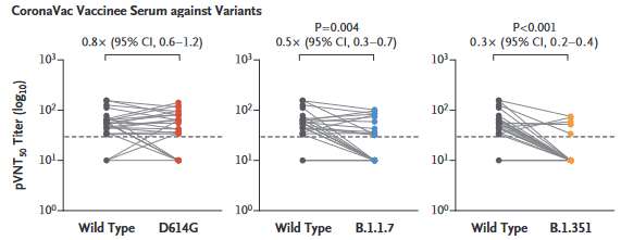 科兴疫苗接种者血清里中和抗体对D614G突变株、英国突变株(B.1.1.7)以及南非突变株(B.1.351)的中和效率变化情况 | 图源[7]