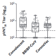 新冠康复者(Convalescent),国药疫苗(BBIBP-CorV)和科兴疫苗(CoronaVac)接种者血清里针对新冠病毒的中和抗体情况 | 图源[7]