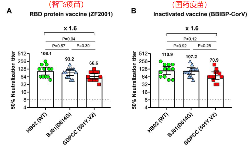 如上图所示,智飞疫苗接种者的血清,对野生型新冠病毒的中和滴度的平均值是106.1,而对南非突变株的中和滴度是66.6。国药疫苗的效果也差不多,接种者血清对野生型新冠病毒的中和滴度的平均值是110.9,而对南非突变株的中和滴度是70.9。
