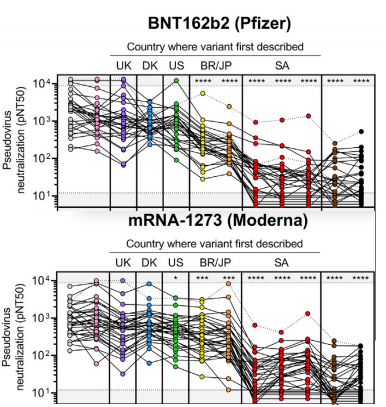 辉瑞疫苗(BNT62b2)和Moderna疫苗(mRNA-1273)接种所诱导的抗体对各新冠突变株的中和实验结果,最左边是野生型新冠病毒,然后依次是英国突变株(UK)、丹麦突变株(DK)、美国突变株(US)、巴西突变株(BR/JP)、南非突变株(SA)| 图源 [5]