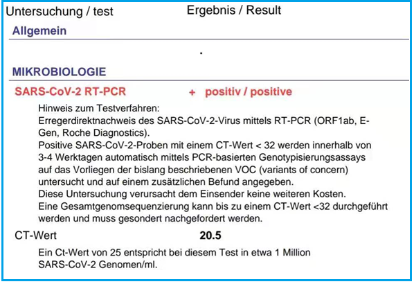 再看了一下病毒的载量,ct值是20.5,根据诊断结果上提供的信息推算,大概相当于每ml里有1600万个新冠病毒基因组,这是一个很高的浓度。