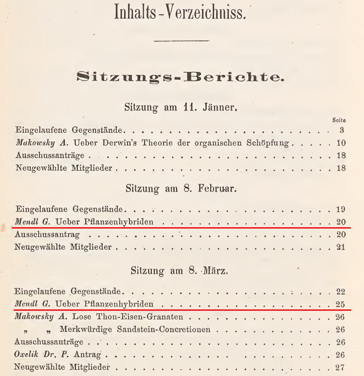 1865年,孟德尔在学会上讲了他豌豆实验的结果。这是他第一次讲植物杂交实验,之前讲的都是气象学的研究。因为报告太长,被分成了上下两部分,分别在2月8日和3月8日的两次例会上宣读。