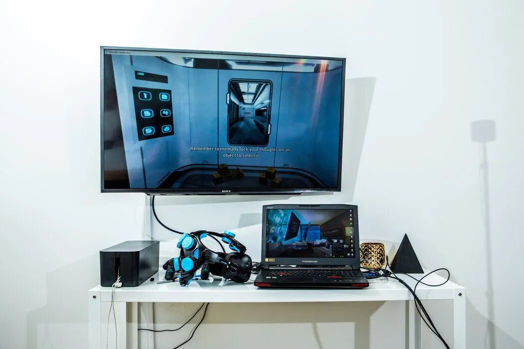 Neurable 做了一个叫《觉醒》的 VR 游戏,在这个密室逃脱游戏里,你只能用意念解谜,比如看向地板上的球体,然后用大脑发出一个捡起的命令,把球撞到镜子上,得到密码,再靠意念输入这些数字输入,给门开锁,成功逃离。
