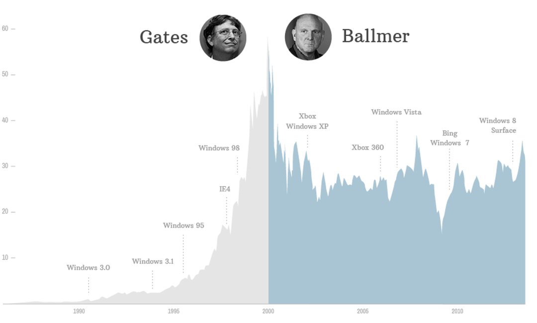 一个 CEO 卸任的时候最尴尬的,可能就是市场的掌声。2013 年当鲍尔默将一年后卸任 CEO 的消息传出后,微软股价大涨 7.3%,创四年来的最大涨幅。这看起来有些难以理解,鲍尔默在 2000 年 1 月升任为 CEO 后的十四年间,他让微软的年营收翻了近四倍。但是股价从未复苏,市值一直在 3000 亿美元左右徘徊。