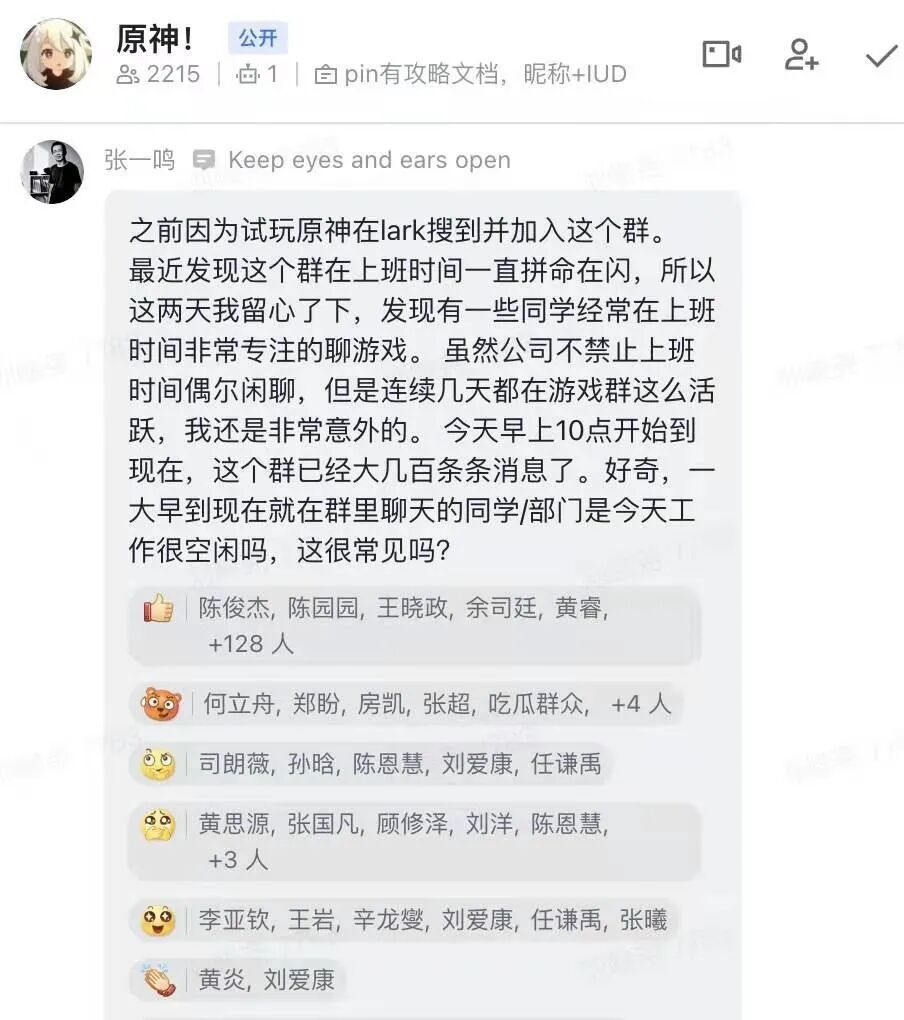 作为公司的创始人,张一鸣不无担忧。典型的表现是 2020 年 12 月 8 日的「原神」事件:在偶然发现一个名叫「原神!」的飞书群里,短短一个上午产生了几百条信息后,张一鸣忍不住在群里质问:「好奇,一大早到现在就在群里聊天的同学/部门是今天工作很闲吗,这很常见吗?」