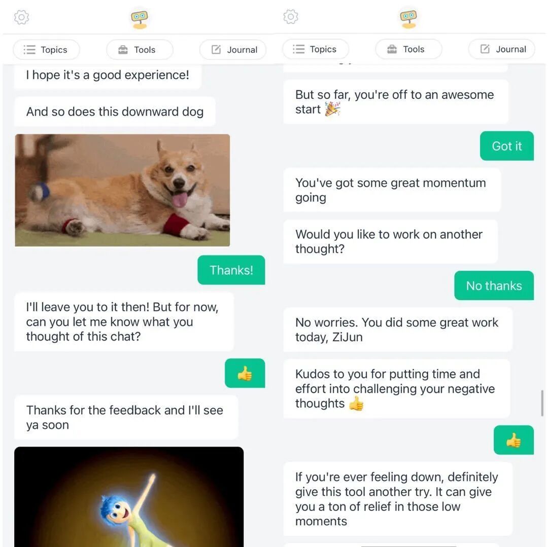 许柯朋友多、健谈,也常和父母聊天,但是「他们不解决情绪问题」。他对 Woebot 的期待是帮他把情绪的阈值降下来,就可以更冷静思考问题。他形容这是「扬汤止沸」的功效,但是确实让他受益,「把情绪拿下去,我自然能做出正确选择」。