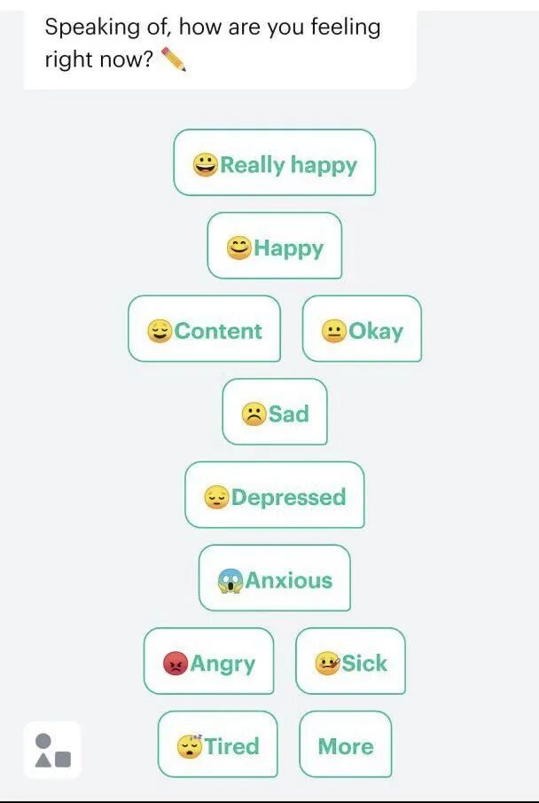 形式上,Woebot 提供的是程序化的聊天。它开启一段对话,询问你此刻的感受。用户大多时候只是在做选择题,在几个可选项中点击,然后阅读 Weobot 不断给出的指引、分析、和例子。只有在少数时候,用户需要写下自己想法或念头。