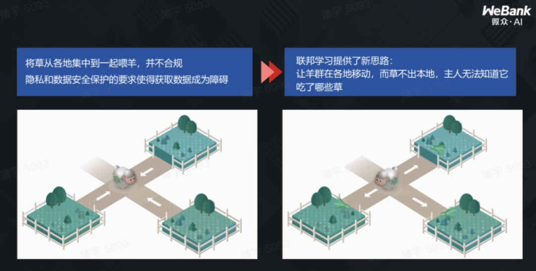 隐私计算包含多个子技术,联邦学习便是其中一种,微众银行的首席 AI 官杨强,曾经把这个模型比作是「羊」,而数据便是「草料」。之前训练模型是集中式的,把草各集中在一起来喂羊,但在运送过程中,草会有丢失的风险,这就是数据泄漏。而联邦学习的做法,是让这头「羊」在各个草场中移动起来,自己去吃草。这样,草就永远只留在本地,主人也不知道吃了什么草,保障了数据安全。