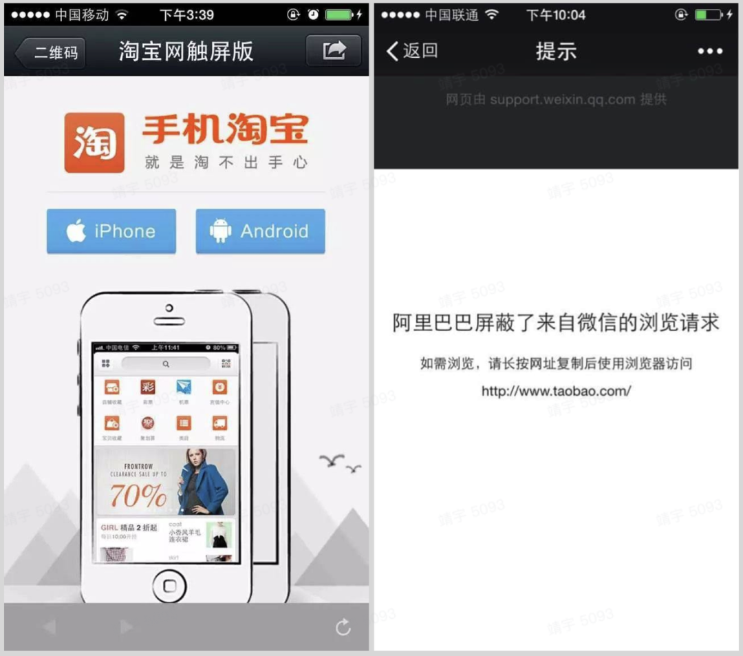 11 月,手淘封杀了微信的所有链接,从微信的淘宝商品及店铺的链接点击进入,会跳转到手机淘宝的下载安装页面。手淘官方给出的理由是「大量用户反映,通过微信朋友圈或者营销号发来的链接点击进入了伪造淘宝店,掉入钱物两空的陷阱,有的用户还误入钓鱼链接,支付账号和密码被套取,银行卡里的资金被盗空,威胁了消费者的个人隐私和安全。」
