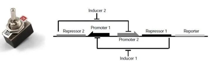 波士顿大学的科学家在大肠杆菌中构建了基因开关 (Gene toggle switch)。这个模型只用了两个基因模块,通过调控外界刺激,可以让基因的表达开或者关。