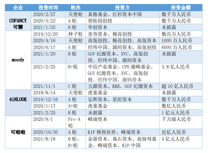 明星项目更是被资本疯狂追捧。如上图所示,原红杉 90 后投资人慈然创立的彩瞳品牌 moody,不到 2 年里拿下 6 轮融资,上个月刚完成的 C 轮,融资额超过 10 亿元。可糖、可啦啦、4iNLOOK 等明星项目,也在过去两年分别完成 3-4 轮融资。这些公司背后的股东,不乏红杉中国、高瓴、腾讯、小红书等明星机构和互联网大厂。
