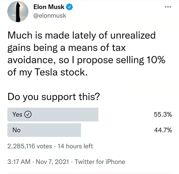在公开出售计划之前,马斯克曾在推特上发起投票,询问 6270 万粉丝,自己是否应该出售 10% 的特斯拉股票(即 1705 万股)。马斯克同时还表示,无论结果如何,他都将「遵守投票结果」。截至 11 月 8 日投票结束时,有 351.9 万人参与,其中接近 6 成的网友投出了赞成票。