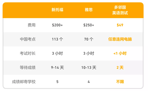 最重要的是高性价比,只需 49 美元即可进行一次英语测试。相比之下,托福雅思考位紧张、费用昂贵、出分较慢的状况不得不说是大量考生心中的痛点。