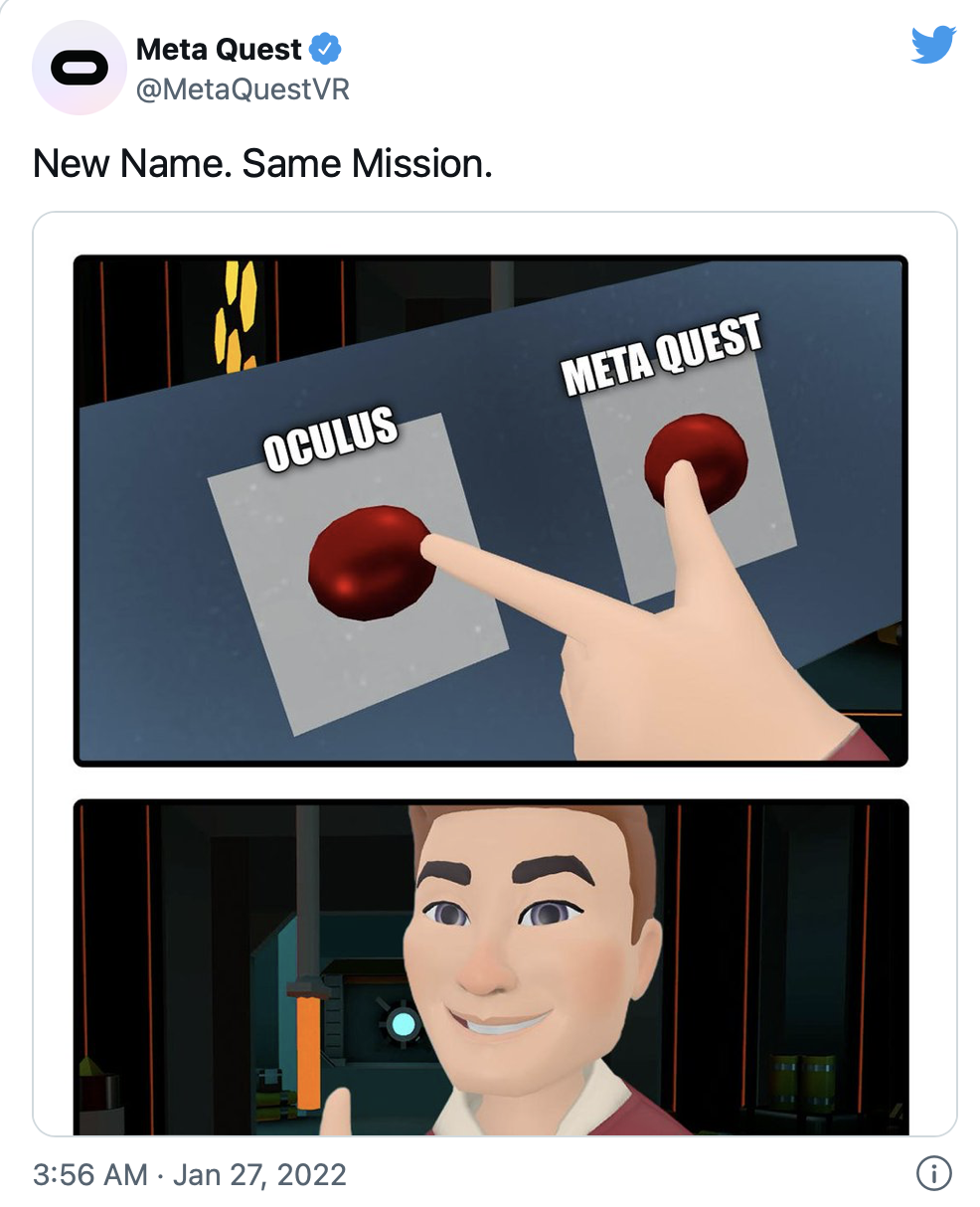 显然 Facebook 官方也听到了网友的呼声,Meta QuestVR 官方账号不得不发出一条澄清 Twitter,表示理解用户对于 Oculus 品牌的依恋,Facebook 此举也是「一个艰难的决定」,「Oculus 依然是 Meta 的核心 DNA」。
