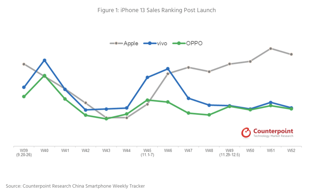 Counterpoint Research 公布 iPhone 13 发布后在中国市场的销售排名