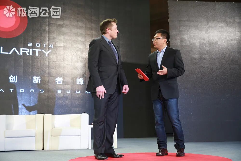 2014 年 4 月 21 日,马斯克在奇点 · 极客公园创新者峰会上与极客公园创始人、CEO 张鹏对谈