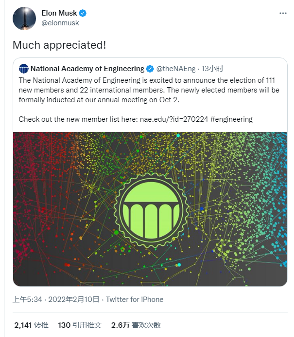 马斯克转发美国国家工程院官方推特