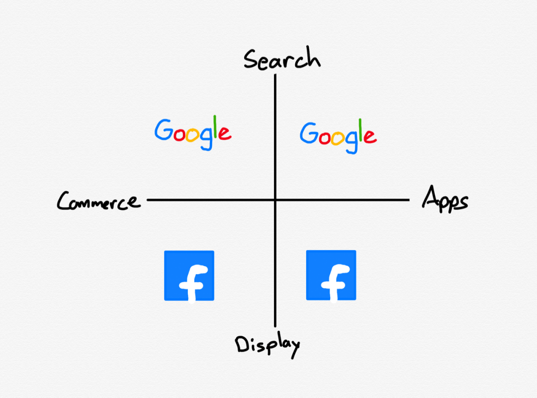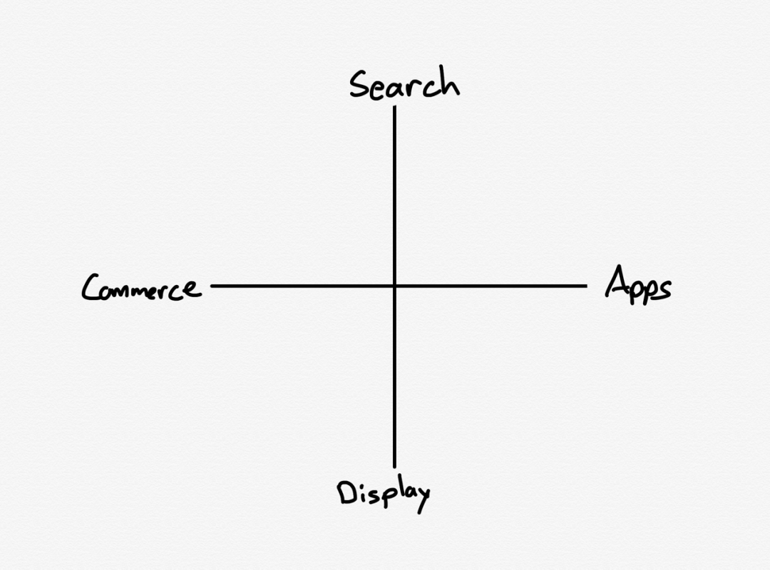 在 2022 年的广告市场上,Facebook 依然是一个主要参与者。为了说明这个市场,可以用一个大幅简化的坐标轴,横轴两端为商业(Commerce)和应用程序(Apps),纵轴两端为搜索(Search)和展示(Display):