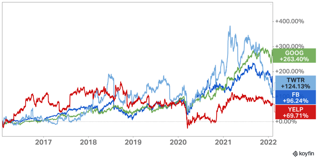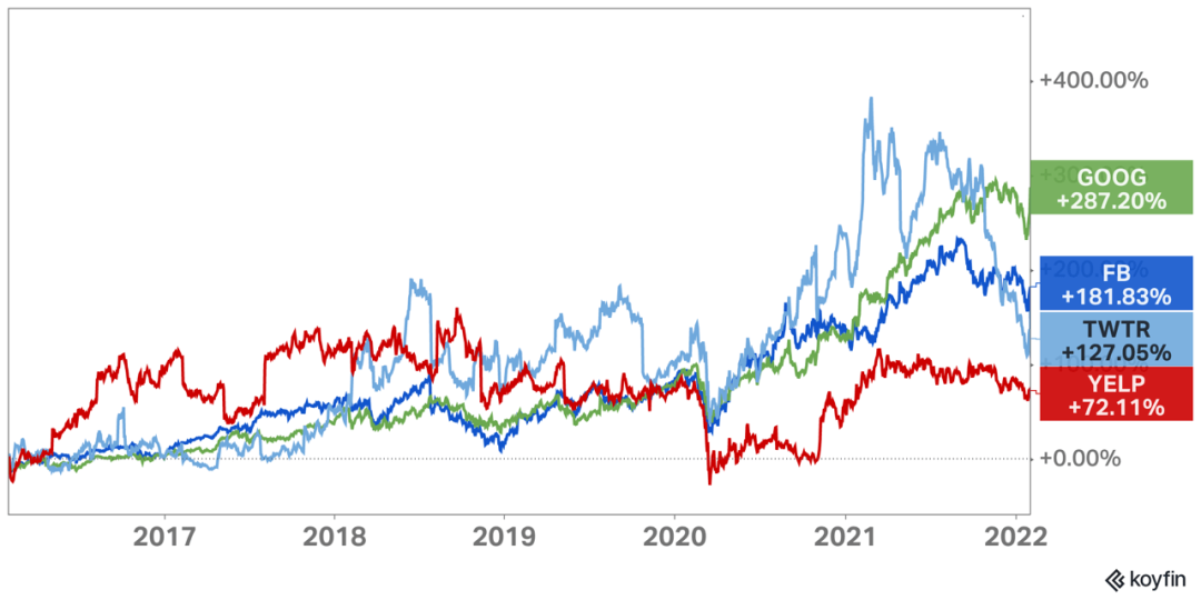 事实也是如此:雅虎已经式微;领英在那几个月后被微软收购;YELP 和推特的股价在此后几乎翻倍,但与谷歌和 Facebook 相比,它们的收益就相形见绌了: