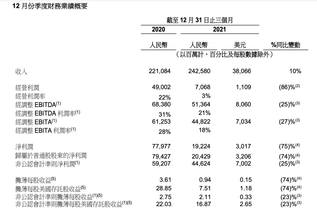 净利润下降主要由于商誉减值、股权投资公允价值变动等非经常性因素。但即使扣除非经常性因素,阿里巴巴第三财季扣非净利润为 446.24 亿元,依然比 2020 年同期下降了 25%。