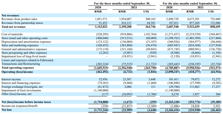 瑞幸咖啡 2021 年 Q3 季报