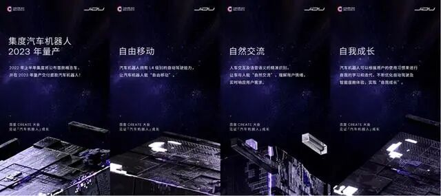 在 2021 年 12 月 27 日举办的的百度 Create 2021(百度 AI 开发者大会)上,百度创始人、董事长兼 CEO 李彦宏表示,集度汽车机器人的产品理念是「自由移动、自然交流、自我成长」,具体表达形式为: