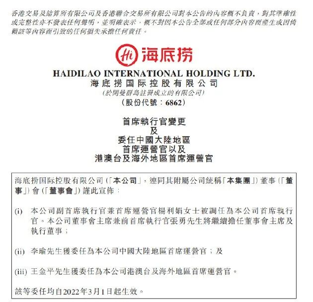 3 月 1 日,海底捞发布管理层人事任命公告,副首席执行官兼首席运营官杨利娟调任首席执行官,董事会主席兼前首席执行官张勇将继续担任董事会主席及执行董事;李瑜出任海底捞中国大陆地区首席运营官,王金平出任港澳台及海外地区首席运营官。