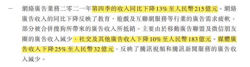 2021 年第四季度,腾讯网络广告收入 251 亿元,同比下降 13%。其中,媒体广告收入下降 25% 至 32 亿元,社交及其他广告收入下降 10% 至 183 亿元,在分发渠道上则体现为腾讯视频和腾讯新闻服务、微信朋友圈广告广告收入的减少。