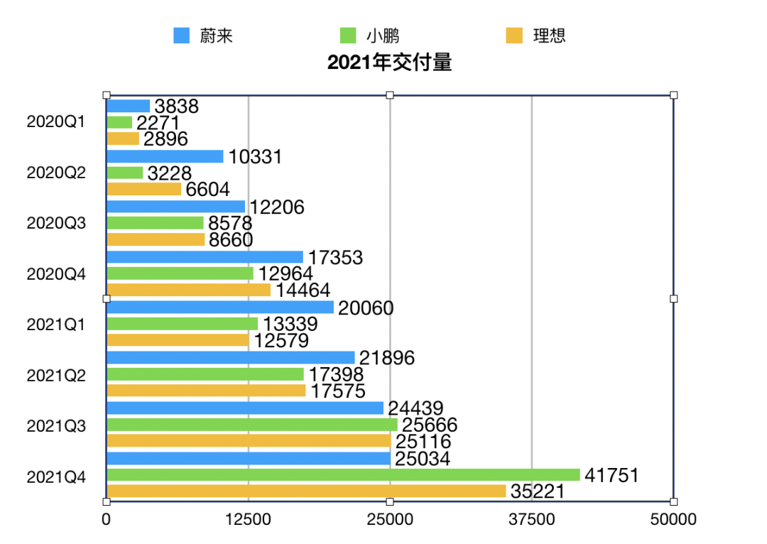 特别是 2021 年第四季度,蔚来增速放缓最为明显。蔚来汽车在 Q4 交付 2.5 万辆,同比增长 44.3%,环比增长仅有 2.4%;相比之下,小鹏汽车和理想共交付 4.18 万辆和 3.52 万辆,同比增长 222% 和 143.5%,环比增速也达到 63% 和 40.2%。