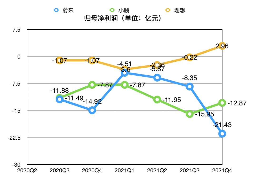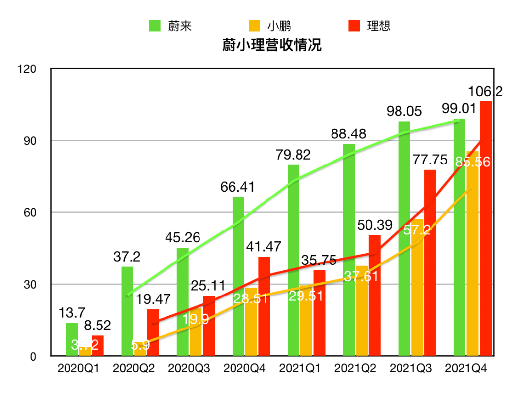 但分别看蔚小理各自的表现,2021 年他们在不同的数据维度上,排名也出现了变化。从市值来看,蔚来>理想>小鹏;从交付量上来看,小鹏>蔚来>理想;从营收上来看,蔚来>理想>小鹏;从亏损情况来看,理想>蔚来>小鹏……叫了几年的「蔚小理」,似乎已经不能完全代表他们的排位。