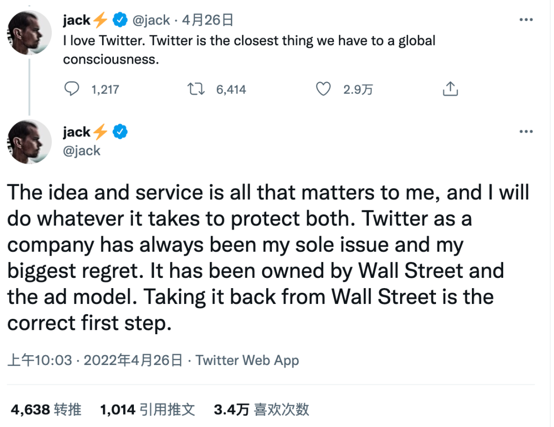 以此为起点,一个更自由民主的 Web3 版本的网络言论平台(协议)将会建立起来。这恰恰也是 Twitter 前 CEO 杰克·多西(Jack Dorsey)一直致力于推动却又屡屡失败的事情——他仅有超过 2% 的持股比例,且没有投票控制权。