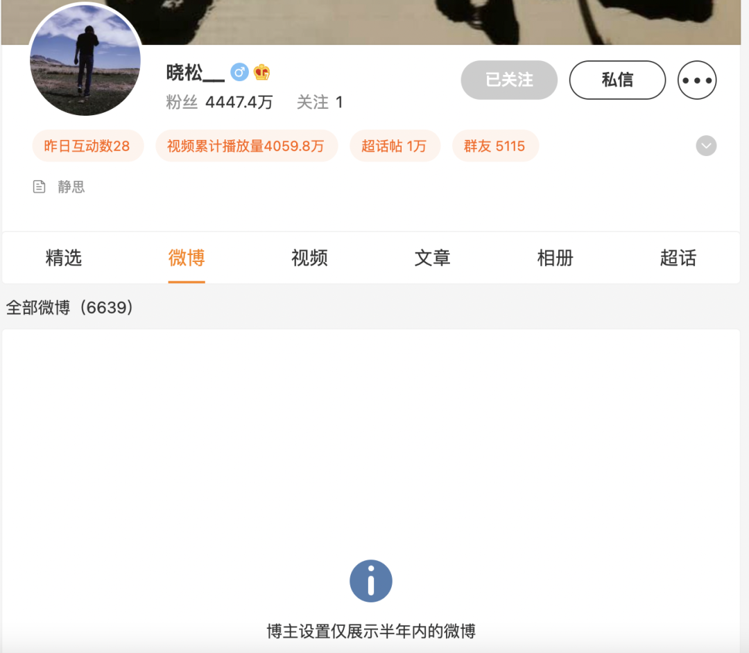 30 年前因为一首《同桌的你》风靡中国,今年 53 岁的高晓松在微博上依然有着 4417 万粉丝,不过已设置半年可见,显示 0 条微博。