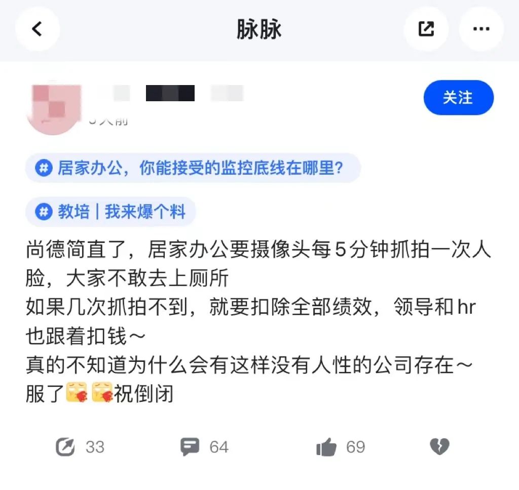 每 5 分钟抓拍一次,这个频率让员工吐槽「不敢去厕所」,质疑公司「没有人性」。