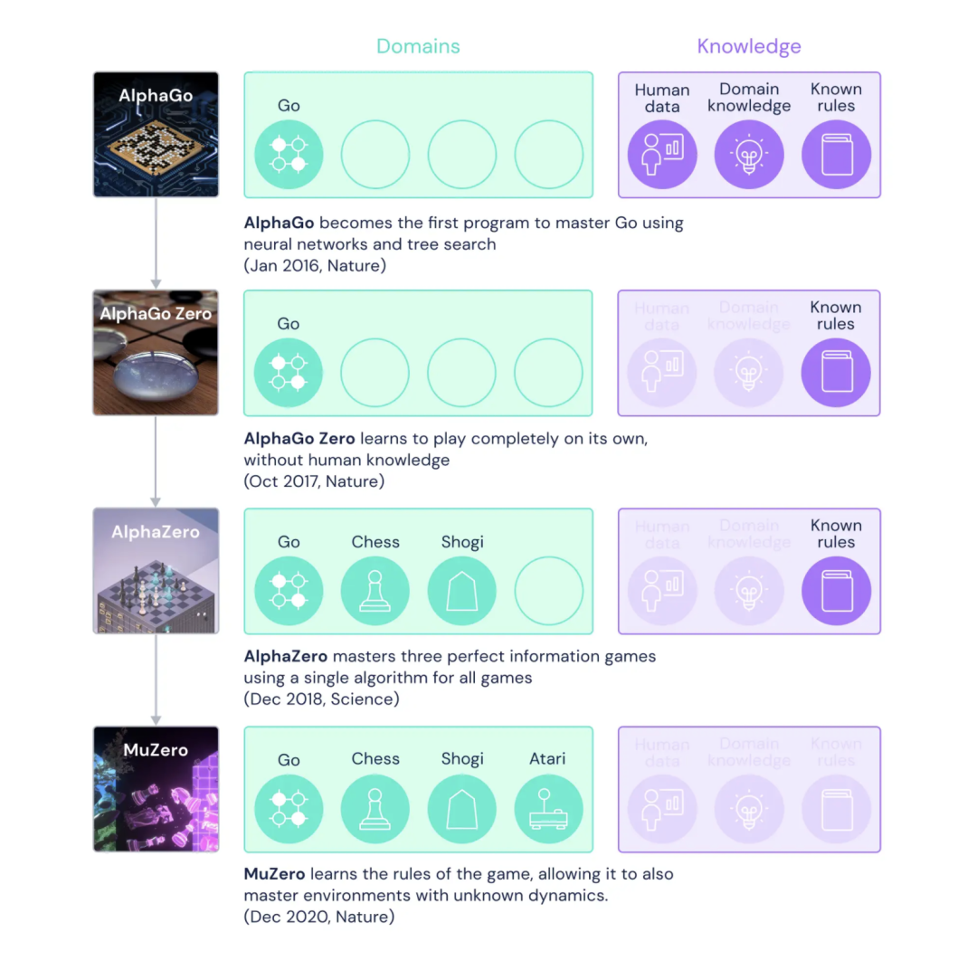 而 MuZero 不知道现有的规则,那么只能从零开始构建一个内部模型,形成自己对棋局的理解。