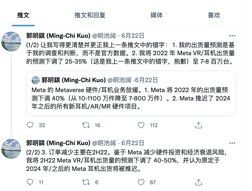 随后郭明錤再次发文称,发货预测是基于调查和判断,而不是官方数据。并更正称 2022 年 Meta VR 头显出货量下调幅度为 25-35%,对应出货量不变,为 700-800 万台。