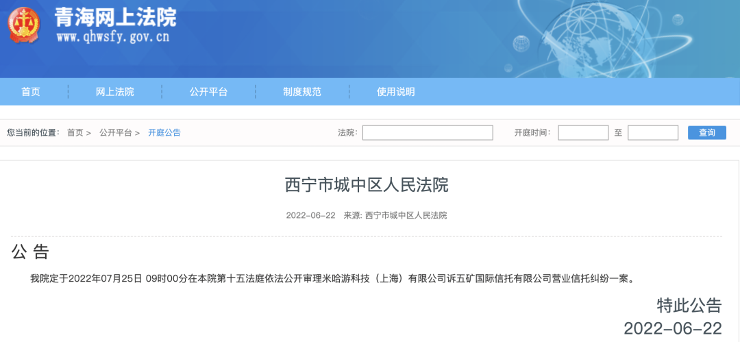 天眼查显示,近日,米哈游科技 (上海) 有限公司新增一条开庭公告。极客公园查询发现,青海网上法院 6 月 22 日发布公告,西宁市城中区人民法院定于 2022 年 07 月 25 日 09 时 00 分,在该院第十五法庭依法公开审理米哈游科技(上海)有限公司及上海莉莉丝网络科技有限公司,诉五矿国际信托有限公司营业信托纠纷一案。