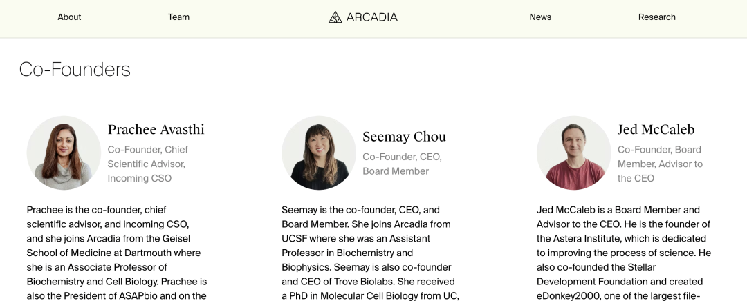 2021 年,两位科学家 Seemay Zhou 和 Prachee Avasti 创立了阿卡迪亚科学实验室(Arcadia Science)。支持者有创始科学家之一 Seemay Zhou 的生活伴侣(life partner) Jed McCaleb(他是加密货币的富豪,也是一个基金的创始人),以及 Open AI 的首席执行官 Sam Altman。