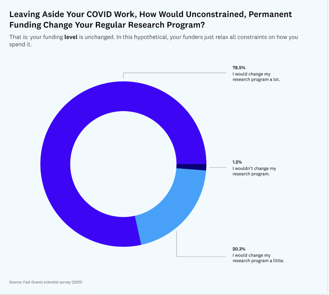 由于这个资助的特点之一是不限制具体的使用方式。他们对研究者会怎样使用不受限制的资金很好奇,对受到资助的科学家做了调研。这让他们发现了一个事实:78.5% 的人表示,如果现有的资金可以不受限制地使用,他们会「大幅」改变研究计划。也就是说,在现有的科研的资助系统中,不太能让人们去追求他们自己觉得「最好」、「最天才」的想法。