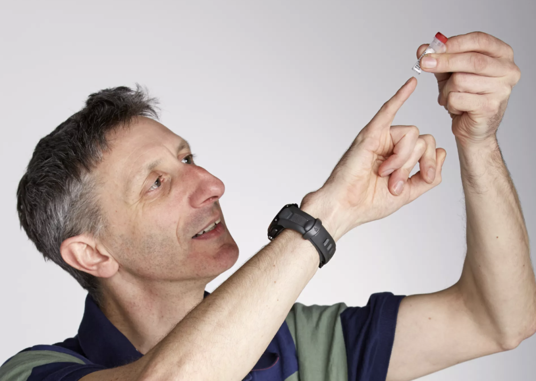Nick Goldman 拿着存储了莎士比亚所有十四行诗、一张照片和「我有一个梦想」演讲片段的 DNA| 来源:EBI