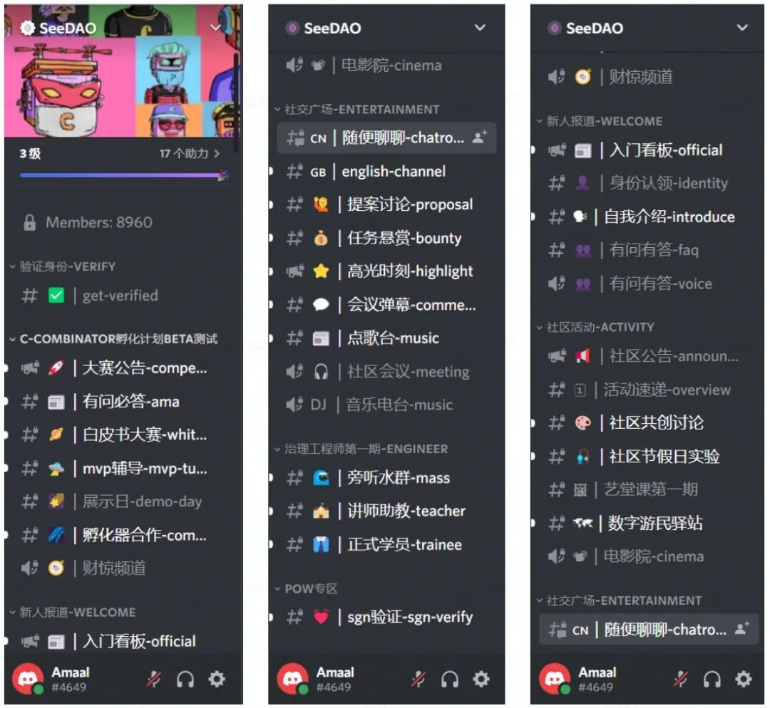 我加入 SeeDAO 的 Discord 服务器,首先看到 Discord 内左边排列的着很多频道,包含了 DAO 内的各种公共设施(新手引导、社交广场等)、近期活动、项目等等。