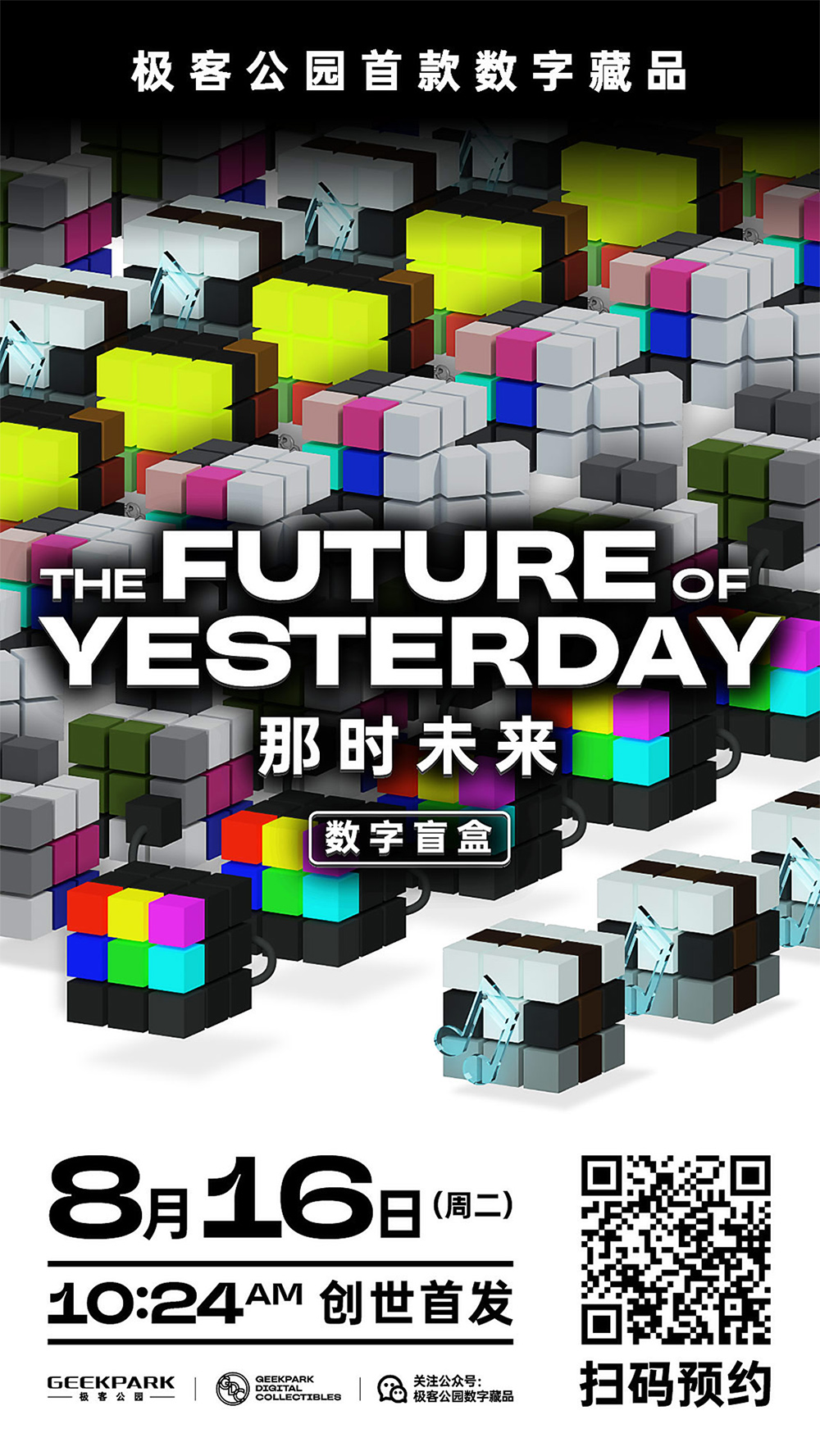 极客公园首款数字藏品「那时未来」盲盒系列将在 8 月16 日上午 10:24 分上线发售啦,扫描下方海报二维码即可登录商城预约哦!