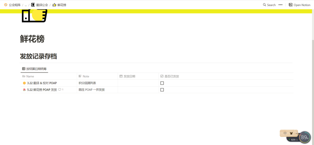 这些工作组成员的贡献值都会被公开透明地记录在公会的 Notion 里,公会管理人员会定期按照工作量积累,为大家发放未来可以被空投 SeeDAO 代币的凭证 POAP。