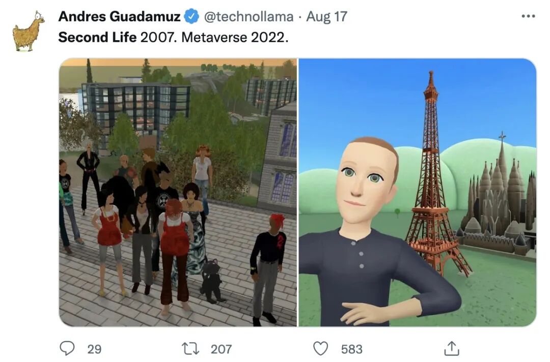 有人把它和 2007 年发布的模拟现实类游戏《第二人生》放到一起对比。