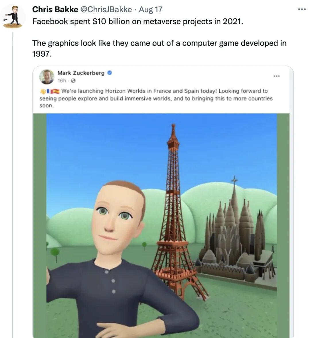 马克·扎克伯格再次在推特上被调侃。周二,他在 Facebook 上传了来自 Horizon Worlds 的化身自拍截图,庆祝 Horizon Worlds 在法国和西班牙的上线。扎克伯格说:期待看到人们在这里探索,建立沉浸化的世界,并且,Horizon Worlds 很快将在更多国家上线。