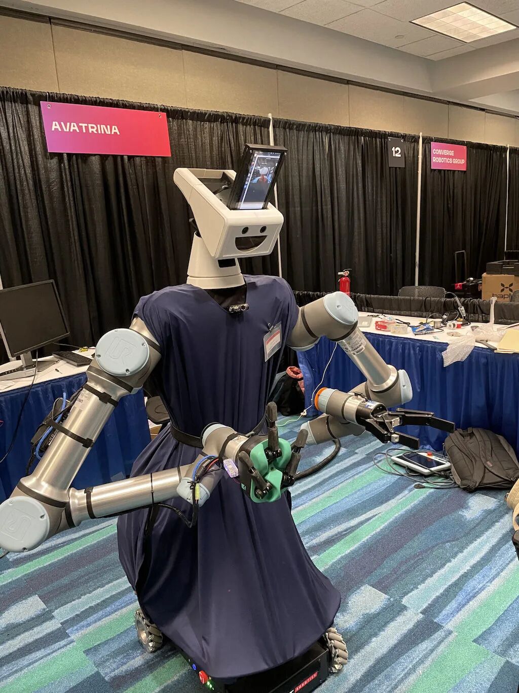 Avatrina 配备了视觉和听觉系统,可以让远程操控人员和机器人面前的人进行沟通,而机器人也能通过头部的平板电脑(即机器人的脸)看到机器人面前的一切。