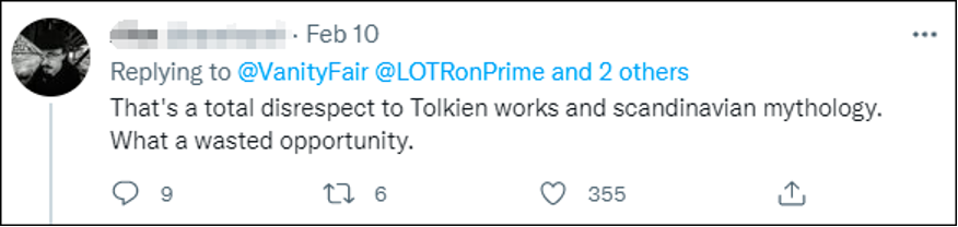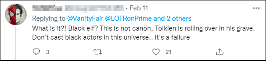 「这根本就是对托尔金作品和斯堪的纳维亚神话的不尊重,白白浪费大好机会。」、「托尔金的棺材板都要压不住了。黑人演员不应该出现在中土世界」...... 在社交媒体关于指环王相关的讨论下,这种观点并不少见。