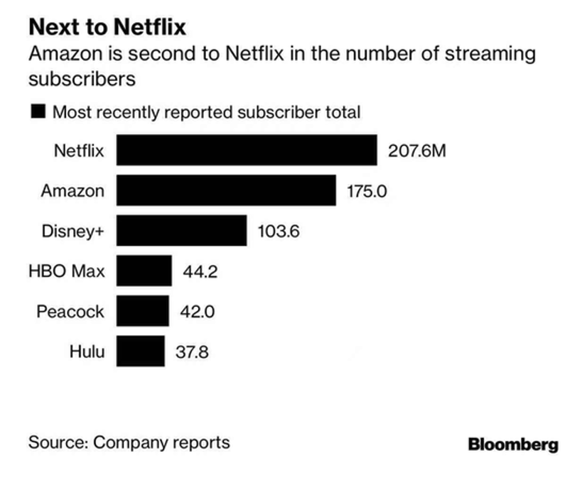 亚马逊已经是订阅数第二的流媒体平台|Bloomberg