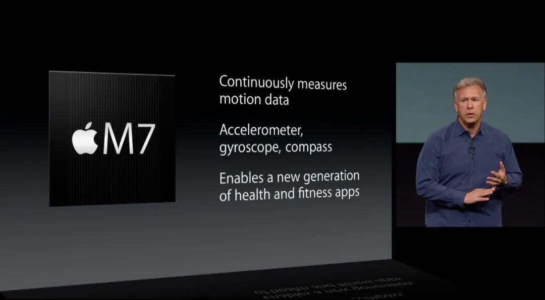 但苹果依然有自己的想法。2013 年,苹果在新发布的 iPhone 5s 上搭载了一颗 M7 协处理器。这颗处理器在设计上和 Apple Watch 的芯片非常相似,可以监测用户的活动,计算你每天走了多少步,且功耗极低,几乎不会影响手机续航。
