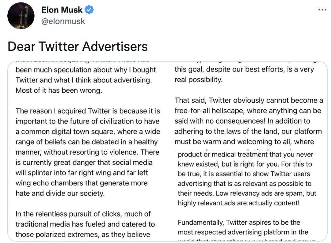 因此,在 Twitter 的「食堂」以新 Boss 的姿态,和员工亲切聊天之后。马斯克做的第一件事,就是在 Twitter 上发布了一封「致推特广告主」的公开信。